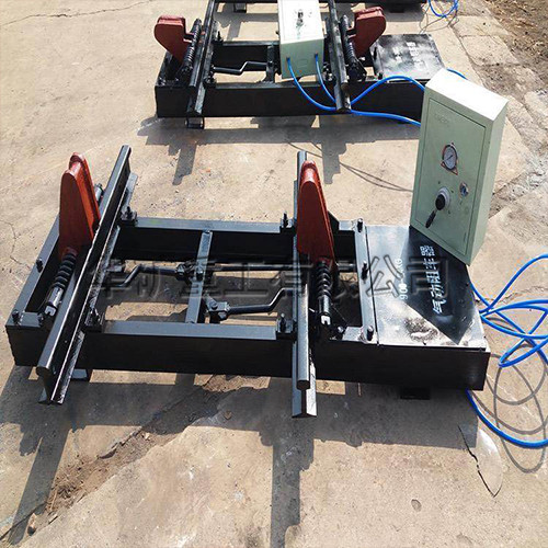 氣動(dòng)阻車器涉及煤礦井下運(yùn)輸機(jī)械技術(shù)領(lǐng)域,氣動(dòng)阻車器由兩根平行的固定支座和阻車桿、前支承座、后支承座及腳踏連動(dòng)裝置組成,單軌阻車器固定支座的兩端分別固定在前支承座和后支承座上,阻車桿置在兩個(gè)固定支座之間,連接在兩個(gè)固定支座之間的轉(zhuǎn)軸穿過阻車桿的中部,阻車桿呈上端小下端粗重狀,自然狀態(tài)下,其上端翹起,腳踏連動(dòng)裝置由腳踏板、拉線和撥桿組成,撥桿的中部鉸接于兩個(gè)固定支承座之間,其上端通過拉線與腳踏板連接。