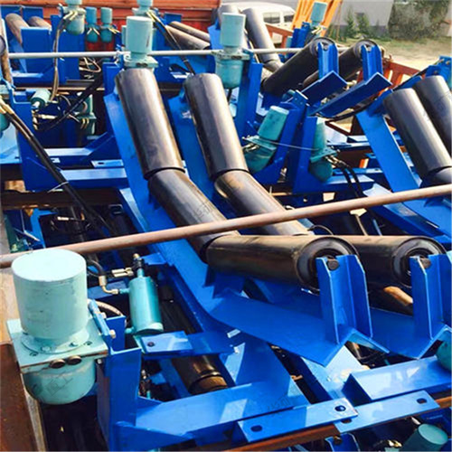 液壓糾偏裝置是由檢驅(qū)輪、油泵、復(fù)合油缸、油管、固定支架構(gòu)成。當(dāng)皮帶運行跑偏時,皮帶和檢驅(qū)輪接觸,檢驅(qū)輪帶動油泵旋轉(zhuǎn),輸出液壓油控制驅(qū)動油缸往復(fù)運動,帶動調(diào)心托輥偏轉(zhuǎn),使調(diào)心托輥的線運動方向與皮帶的運動方向形成。