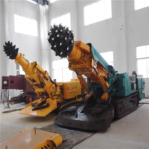 截割頭裝在懸臂上的部分斷面掘進機。懸臂式掘進機要同時實現(xiàn)剝離煤巖、裝載運出、機器本身的行走調(diào)動以及噴霧除塵等功能,即集切割、裝載、運輸、行走于一身。它主要由切割機構(gòu)、裝載機構(gòu)、運輸機構(gòu)、行走機構(gòu)、機架及回轉(zhuǎn)臺、液壓系統(tǒng)、電氣系統(tǒng)、冷卻滅塵供水系統(tǒng)以及操作控制系統(tǒng)等組成。其中切割臂、回轉(zhuǎn)臺、裝渣板、輸送機、轉(zhuǎn)載機、履帶等為主要工作機構(gòu)。